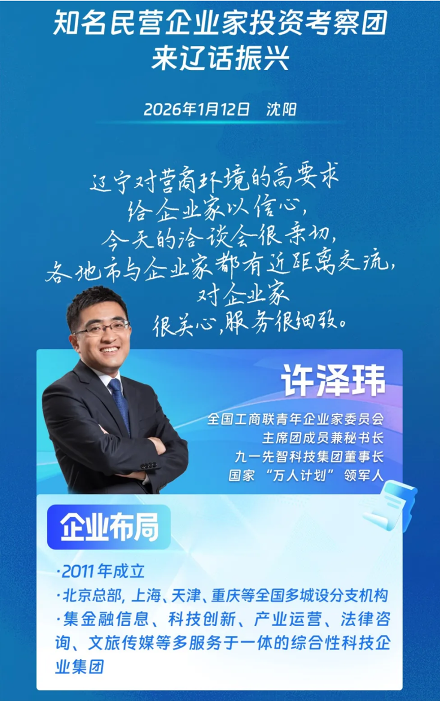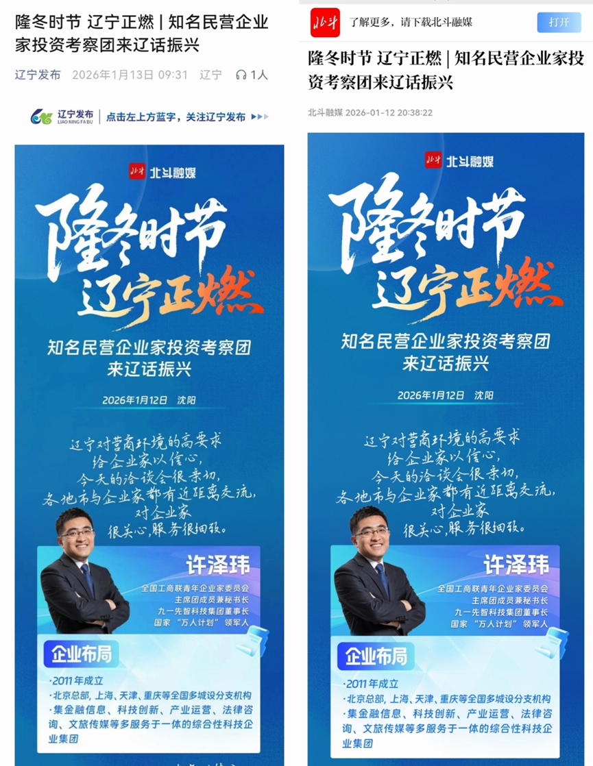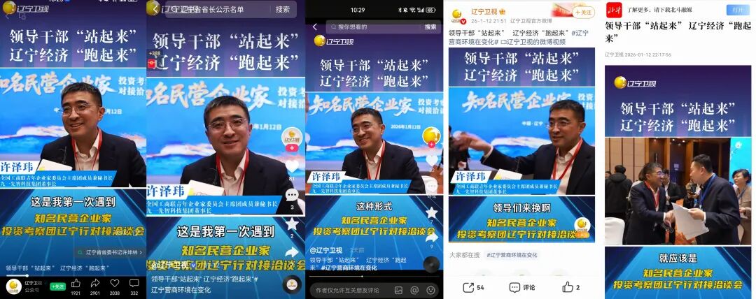 1月12日,《辽宁卫视》视频号、微博、抖音等多平台,“辽宁发布”报道知名民营企业家投资考察团辽宁行对接洽谈会活动。全国工商联青委会主席团成员兼秘书长、91科技集团董事长许泽玮表示,此次洽谈形式新颖——企业家坐着不动,领导们主动走过来轮换交流,就像过去相亲一样,让他印象特别深刻。更高效的是,现场多地迅速建群,把企业与相关部门直接连在一起,以前找人要到处问,现在一键入群,沟通零距离。他认为辽宁对营商环境的高要求,细致入微的服务和各地市与企业家的近距离互动,充分体现了对企业家的关心与尊重,极大增强了投资信心。