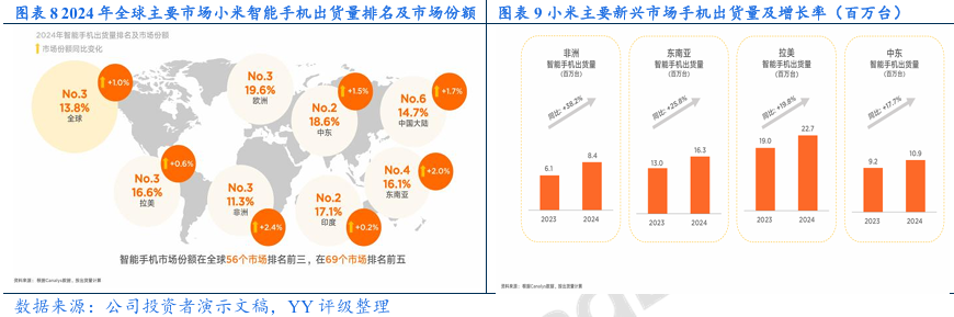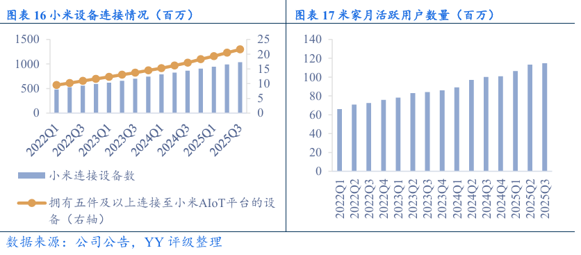 智能手机:智能手机为小米的核心产品,在市场上具有较强的竞争力,海外市场深耕新兴市场。小米手机用“低价高配”快速打开市场,然后逐步向高端化转型:(1)与徕卡合作,进军高端影像领域;(2)打造澎湃OS操作系统,为实现“人家车全生态”布局打基础;(3)小米自研旗舰级3nm手机芯片—玄戒O1于2025年推出,成为全球第四家能够研发3纳米芯片的企业;(4)AI功能也是小米手机未来开发的核心方向,2025年自研AI大模型Xiaomi MiMo-V2-Flash已正式开源上线。随着高端化的不断推进,小米手机的ASP稳健增长,但与国内主流手机厂商相比仍处于较低水平,在新兴市场中,小米手机的市场份额和ASP均低于三星和vivo,小米手机想要摆脱“平价”的印象仍需要一段时间。