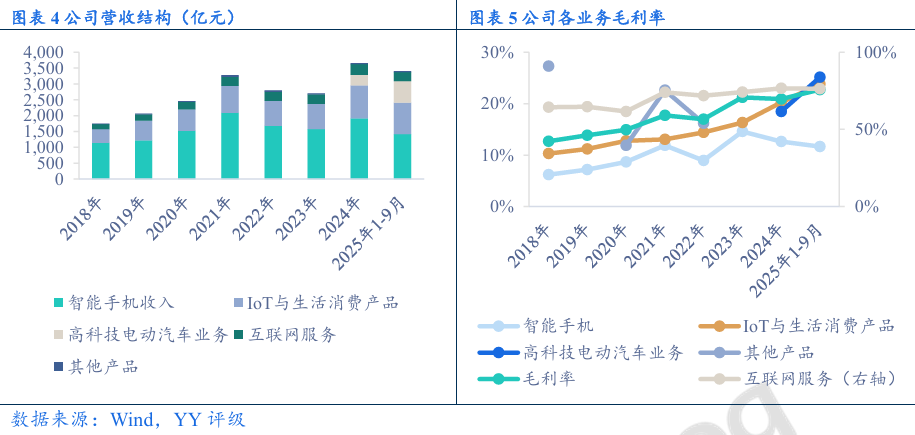 IoT与生活消费品:小米是全球领先智能物联网平台,产品形成“1+4+N”布局,随着小米“人家车全生态”闭环,业务间的协同效应优势将进一步体现。小米设备的连接规模持续提升,小米家居日常生活的使用率不断提高。小米家电凭借低价优势,市占率不断提升,TWS耳机和可穿戴腕带设备均处于行业领先地位。虽然小米家电凭借低价有一定的竞争优势,但仍面临龙头企业的竞争压力,同时随着国补政策退坡,小米IOT和生活消费品业务或将面临一定增长压力。