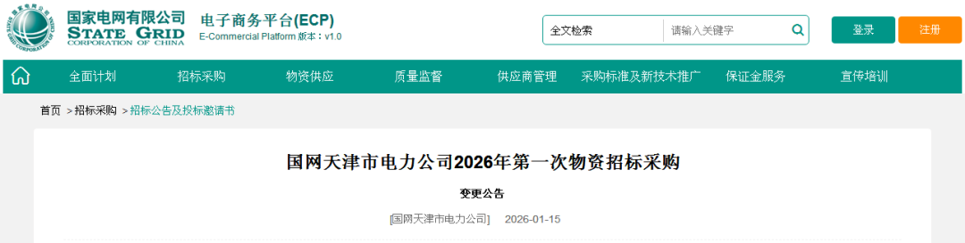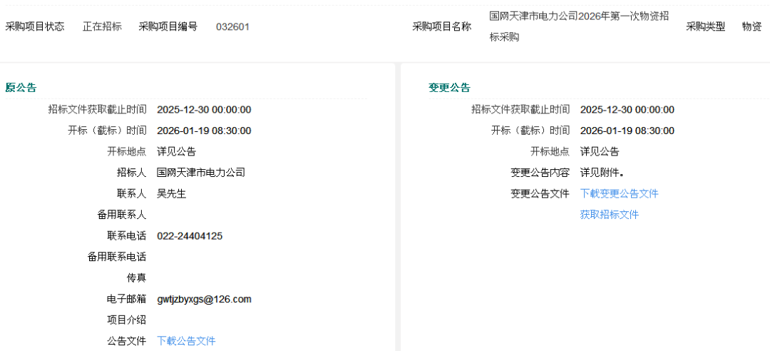 国网天津市电力公司2026年第一次物资招标采购变更公告