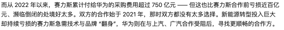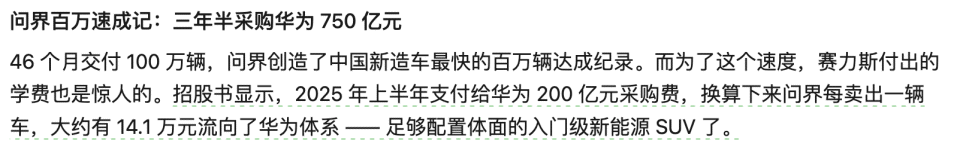 日前,国内知名汽车媒体《晚点AUTO》在官方账号上给出了两组特别有意思的数据,一组是,自2022年以来,赛力斯累计付给华为的采购费用为750亿元,另一组是2025年上半年赛力斯支付给华为200亿元采购费,换算下来问界每卖出一辆车,大约有14.1万元流向了华为体系,足够购买一辆体面的入门级SUV了。