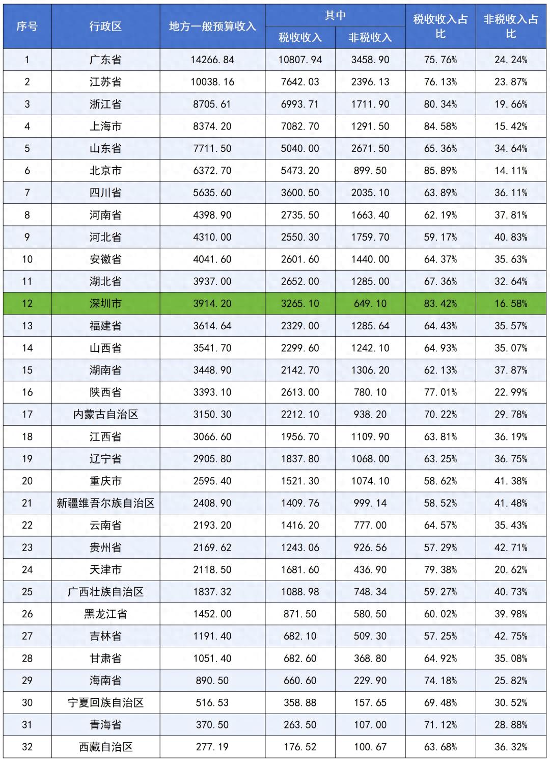 这期内容,笔者统计了全国各省级行政区地方一般预算收入情况(本期数据不包含港、澳、台三地),从汇总表可以比较直观地看出各省级行政区的地方财政实力。如果单独把深圳市拎出来,放到汇总表进行排序,我们会发现深圳市的地方一般预算收入总额可以排到全国12名。
