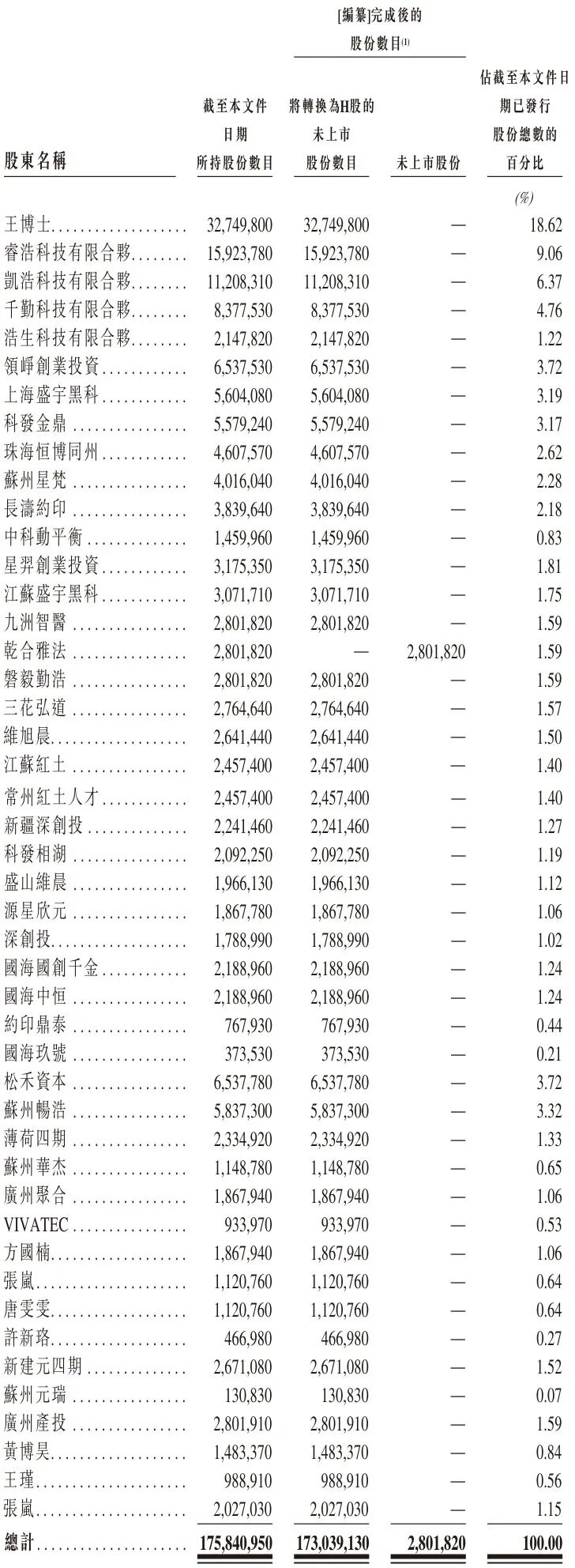 IPO前,王博士持股为18.62%,睿浩科技有限合伙持股为9.06%,凯浩科技有限合伙持股为6.37%,千勤科技有限合伙持股为4.76%,浩生科技有限合伙持股1.22%,领峥创业投资持股为3.72%,上海盛宇黑科持股为3.19%,科发金鼎持股为3.17%,珠海恒博同州持股为2.62%;