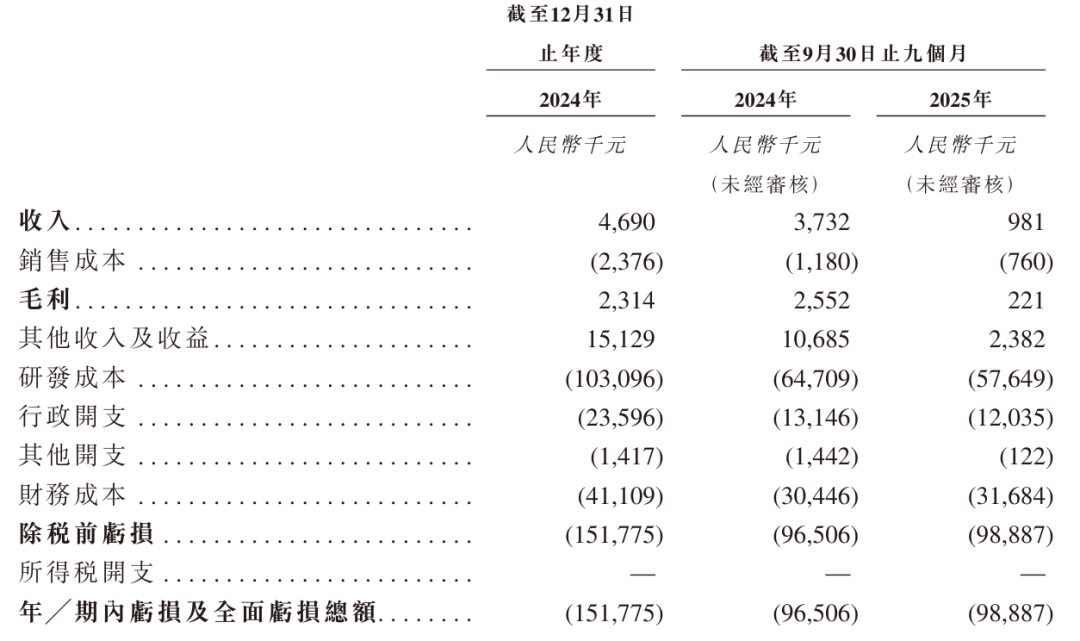 招股书显示,勤浩医药2024年营收为469万元,毛利为231万元,期内亏损为1.52亿元;2025年前9个月营收为98万元,期内亏损为9889万元。