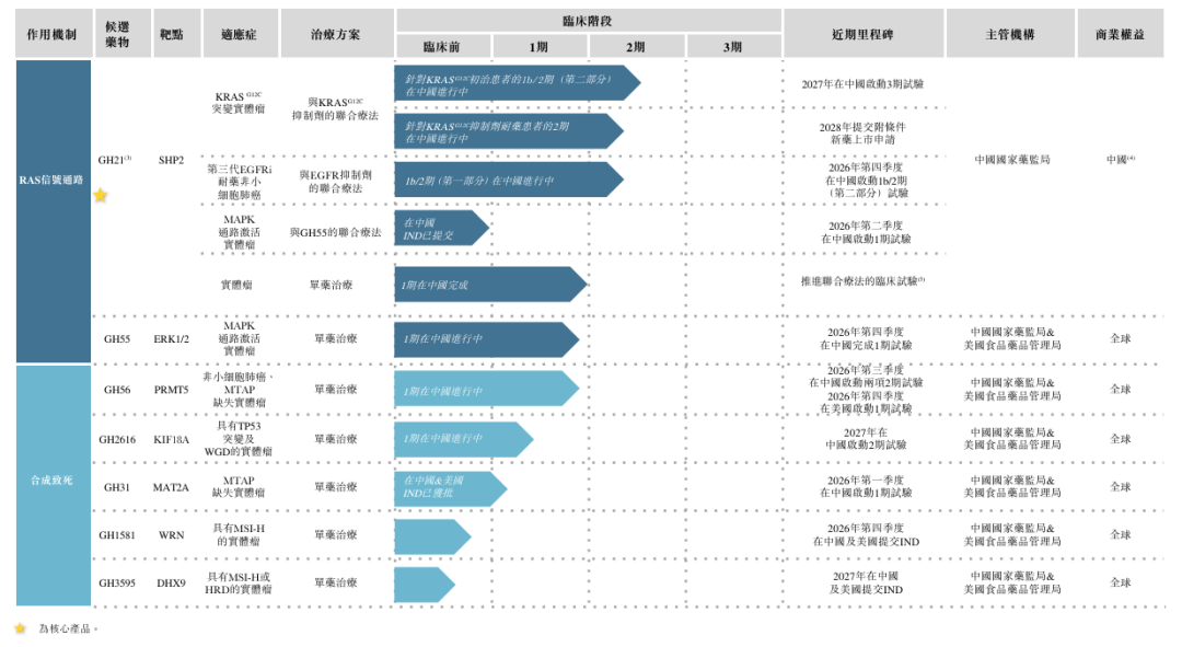 勤浩医药于2021年11月从国家药监局获得GH21单药治疗晚期实体瘤的IND批准,于2022年5月开始其1期单药治疗临床试验,并于2025年3月获得临床研究报告从而完成1期临床试验。