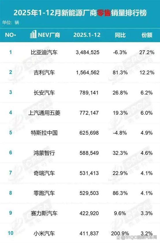 2025年新能源车企销量十强,前十车企谁是增长王?