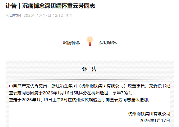 中国共产党优秀党员,浙江冶金集团(杭州钢铁集团有限公司)原董事长、党委原书记童云芳同志因病于2026年1月16日5时4分在杭州逝世,享年79岁。