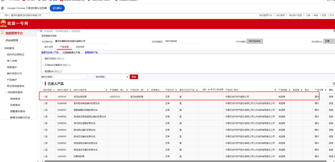 2025年,利通科技成功纳入中国石油天然气集团公司一级物资供应商体系,准入产品覆盖高压钻探胶管系列。这一关键突破,标志着企业在高端能源装备核心零部件领域的综合技术实力与产品品质获得行业权威认证,为我国油气装备核心零部件自主化进程迈出坚实一步。