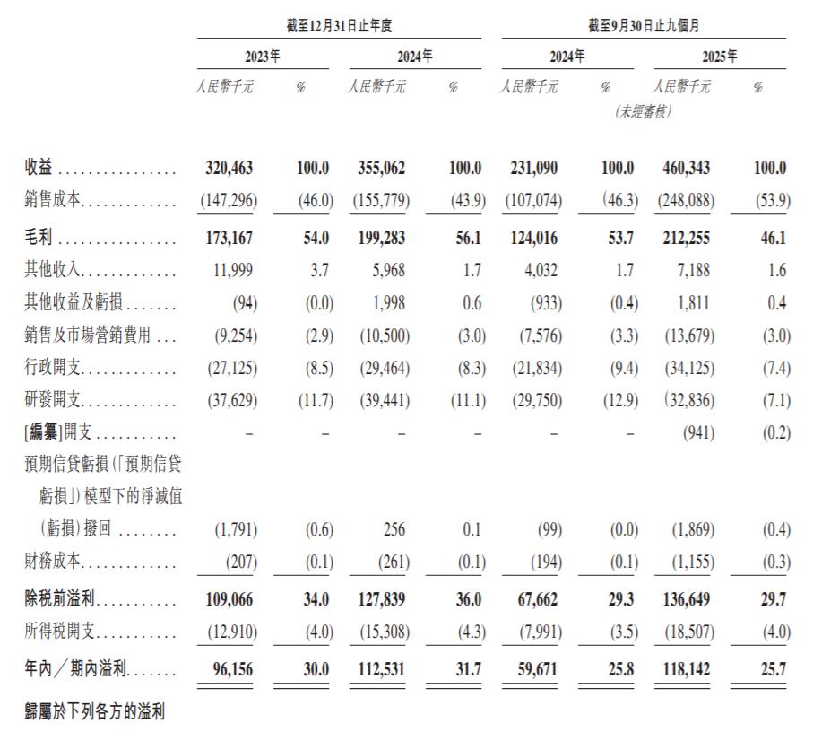 业绩方面,2023年、2024年及2025年前9个月,贝斯特新材的收益分别为3.20亿元、3.55亿元及4.60亿元,各期内利润分别为9615.6万元、1.13亿元及1.18亿元。