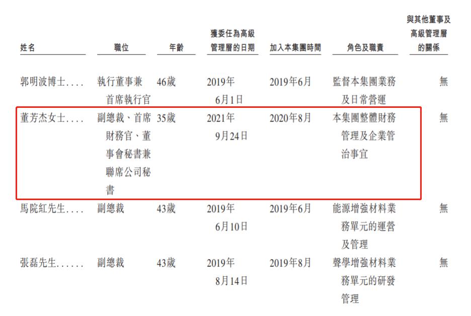 贝斯特新材董事会目前由七名董事组成,包括两名执行董事、两名非执行董事及三名独立非执行董事。另外还有四名高管,其中“90后”董芳杰一人身兼三职。