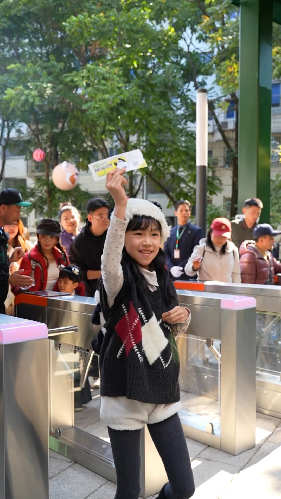 中午12:00,福州熊猫世界正式开园,第一波游客早已迫不及待地在园区外排队等候。其中,第一位入园的幸运“小游客”正高兴地向镜头挥舞着门票。