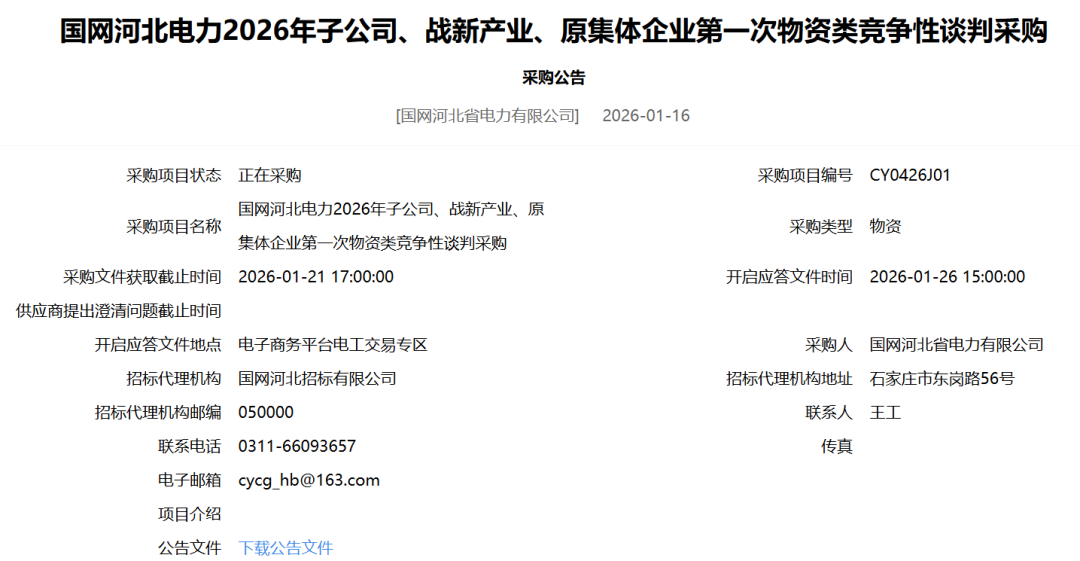 国网河北电力2026年子公司、战新产业、原集体企业第一次物资类竞争性谈判采购采购公告