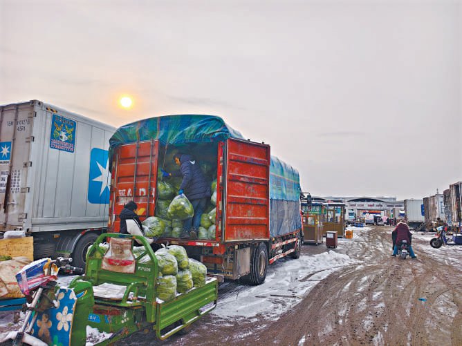 在新发地市场南方蔬菜交易区,大货车整齐排列,大部分车厢门紧闭。如今很多蔬菜都已“住”进了泡沫箱,车厢内部也做了多重防护:有的为蔬菜盖上棉被,有的在车门处悬挂塑料布,以保护这些娇嫩的菜品。