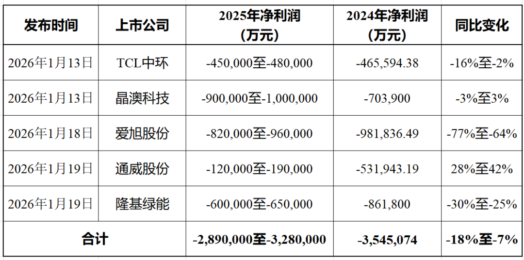近期,晶澳科技、TCL中环、通威股份、隆基绿能、爱旭股份陆续发布了2025年的业绩预告,如下表所示。