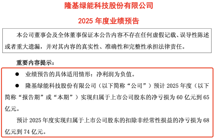1月18日,隆基绿能发布业绩预告称,预计2025年度实现归属于上市公司股东的净亏损60亿元到65亿元;预计2025年度实现归属于上市公司股东的扣除非经常性损益的净亏损为68亿元到74亿元,亏损金额有所缩减。