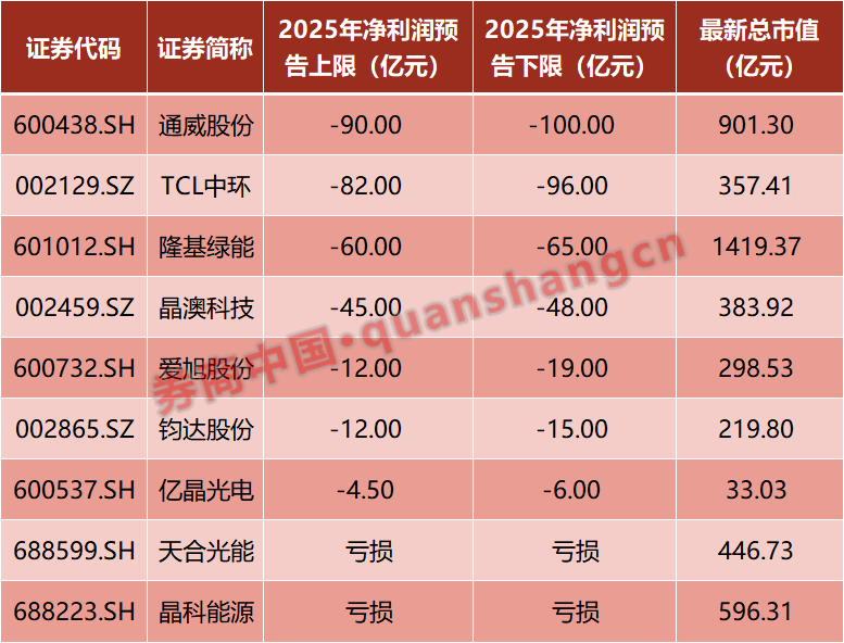 本月以来,晶澳科技、TCL中环、天合光能、晶科能源、钧达股份和大全能源也陆续发布业绩预亏公告,其中天合光能、晶科能源尚未披露业绩亏损金额范围,但均表示预计2025 年年度实现归属于母公司所有者的净利润为负值。