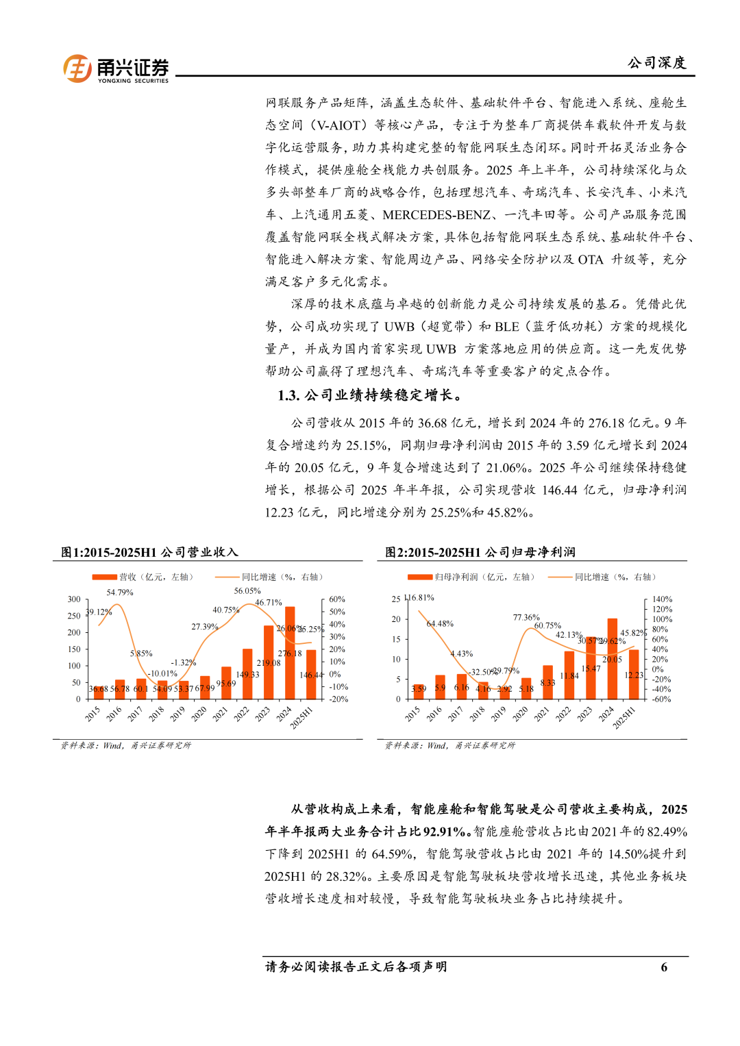 国际领先的移动出行公司。德赛西威是国际领先的移动出行科技公司之一,聚焦于汽车智能化的核心产业——智能座舱、智能驾驶、网联服务,连续多年保持行业领先。目前主要有智能座舱、智能驾驶和网联服务及其他业务。公司业绩保持稳健增长。2015-2024年公司营收和归母净利润的复合增速分别为25.15%和21.06%。2025H1公司实现营收146.44亿元,归母净利润12.23亿元,同比增速分别为25.25%和45.82%。