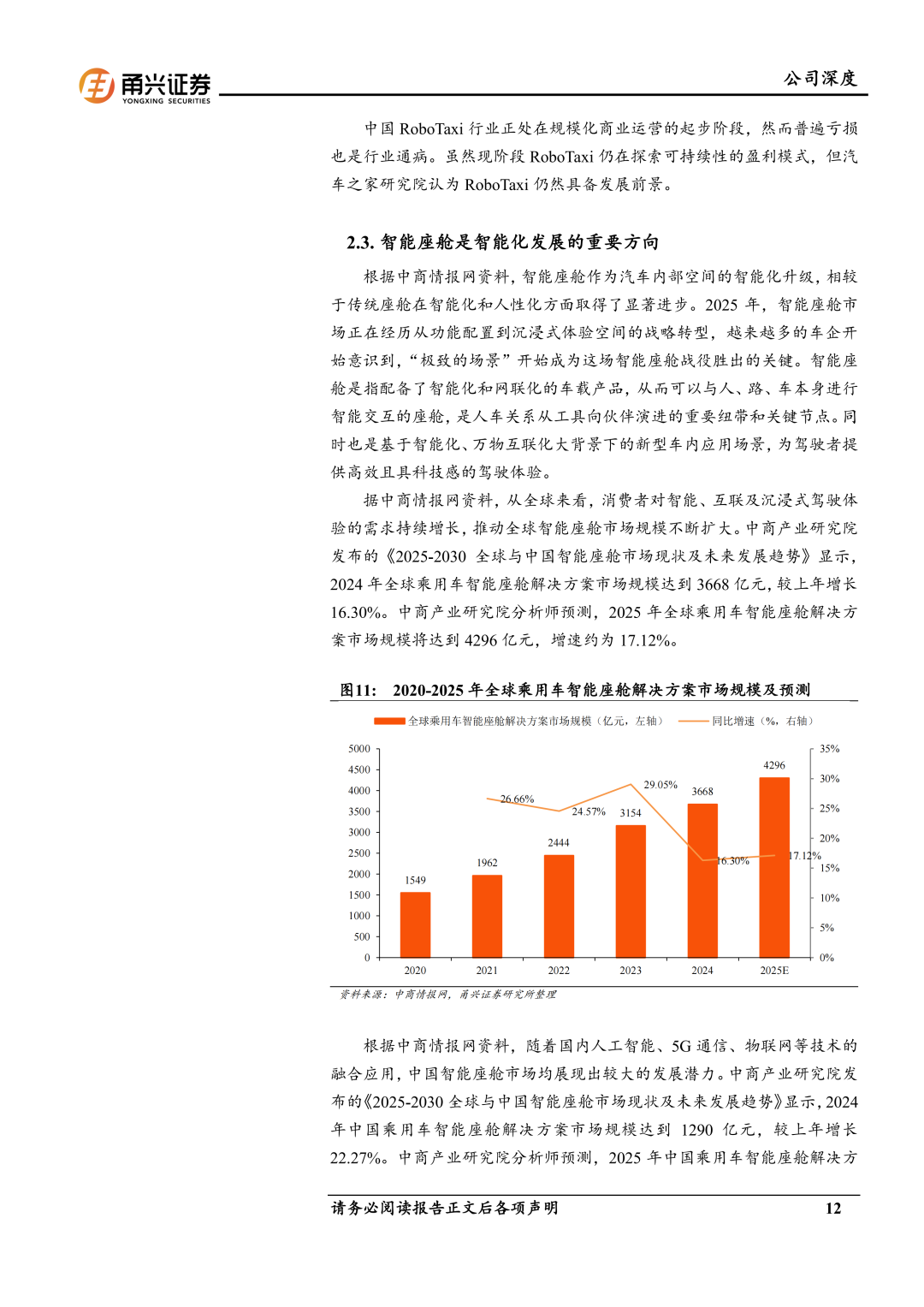 智能座舱行业保持稳健发展,公司市占率领先。中商产业研究院分析师预测,2025年全球乘用车智能座舱解决方案市场规模将达到4296亿元,增速约为17.12%。2025年中国乘用车智能座舱解决方案市场规模将达到1564亿元,同比增长21.24%。根据中商情报网数据,2024年1-12月,座舱域控加速渗透,国产供应商抢占前排。从装机量和市场份额数据来看,德赛西威以16.1%的市场份额位居榜首。