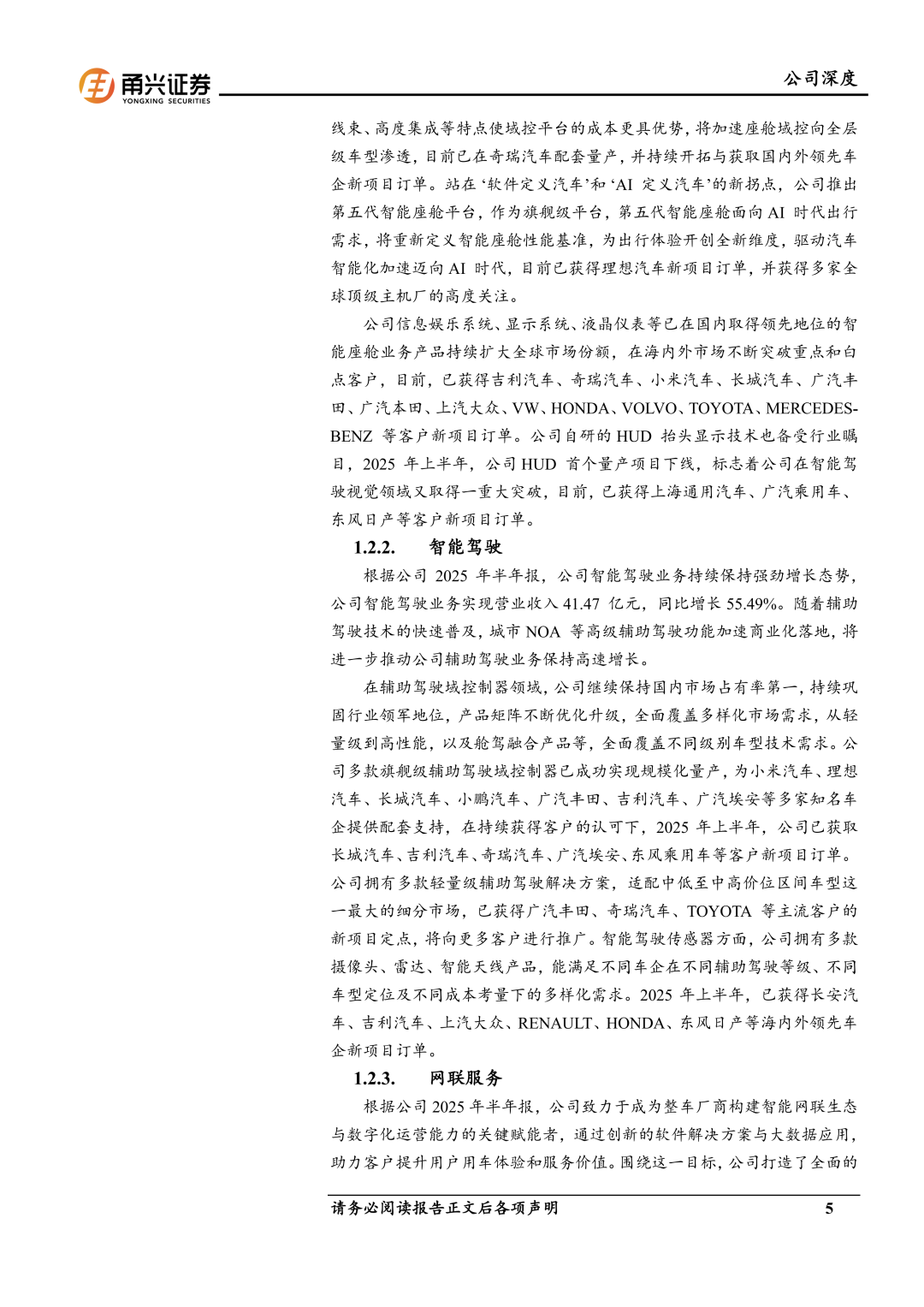 客户矩阵丰富,打造全球服务能力。公司与众多国内外车企已经建立长久、稳定的合作关系。公司客户群体主要包括国内自主品牌客户、合资品牌客户与海外客户。自主品牌客户包括理想汽车、奇瑞汽车、吉利汽车、长城汽车、广汽埃安、小鹏汽车、比亚迪、广汽乘用车、上汽乘用车等,国内合资品牌客户包括一汽-大众、一汽丰田、广汽丰田、上汽大众、长安福特、上汽通用汽车等,海外客户包括MAZDA、TOYOTA、STELLANTIS、DAF、SKODA、VOLKSWAGEN、CATERPILLAR、SUZUKI、AUDI、LEXUS、SCANIA等。公司已完成德国、法国、西班牙、日本、新加坡等主要国家和地区的海外分支机构战略布局,西班牙智能工厂预计将于2026年开始量产,为欧洲地区提供智能座舱、辅助驾驶领域的系列前沿智能化产品。