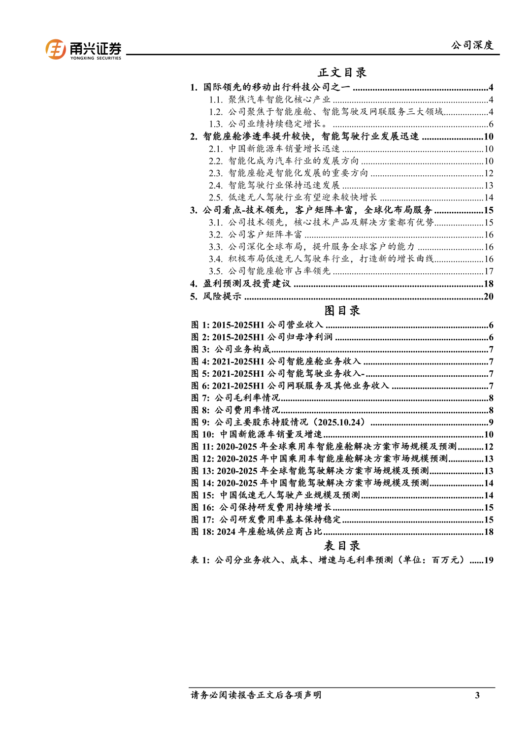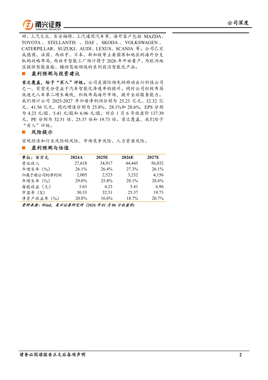首次覆盖,给予“买入”评级。公司是国际领先的移动出行科技公司之一,有望充分受益于汽车智能化渗透率的提升。同时公司积极布局低速无人车第二增长曲线,积极布局海外市场,提升全球服务能力。我们预计公司2025-2027年归母净利润分别为25.23亿元、32.32亿元、41.56亿元,同比增速分别为25.8%、28.1%和28.6%,EPS分别为4.23元/股、5.41元/股和6.96元/股,对应1月6号收盘价137.39元,PE分别为32.51倍、25.37倍和19.73倍。首次覆盖,我们给予“买入”评级。