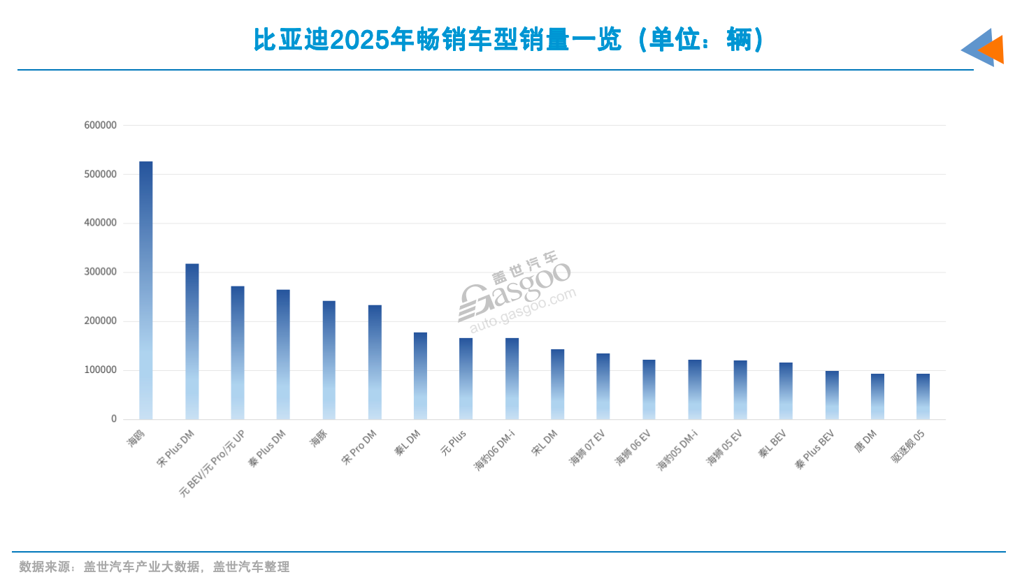 当然,仅靠海鸥远不足以支撑其庞大的销量体系。盖世汽车产业大数据显示,比亚迪旗下年销量超过10万辆的车型多达十余款。年销量在30万辆以上的还有宋Plus DM;年销20万-30万辆区间的有元系列、秦Plus DM、海豚、宋Pro DM等多款产品;年销10万-20万辆区间的也有海狮05 EV、秦L BEV等数款产品;另有数款车型年销量接近10万辆规模。