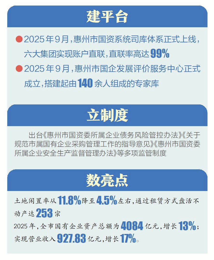 从“管资产”到“管资本”,一字之变,体现的是监管理念、体系、能力的系统性重塑。市国资委负责人表示,站在“十五五”的新起点,接下来,市国资委将严格按照市委、市政府部署要求,推动市属国企聚焦主责主业,围绕“管好资金、管好投资、管住风险、提升能力”深化穿透式监管,切实增强国资投资收益和国有资产保值增值能力,为惠州打造广东高质量发展新增长极贡献更多国资国企力量。