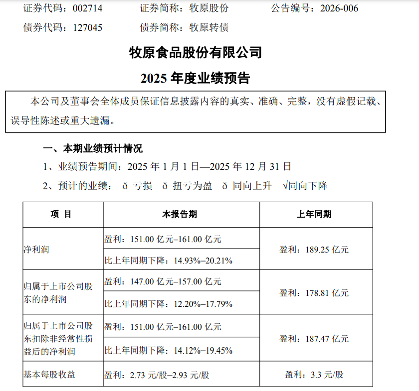 牧原股份2025业绩预告,预计实现净利润超150亿