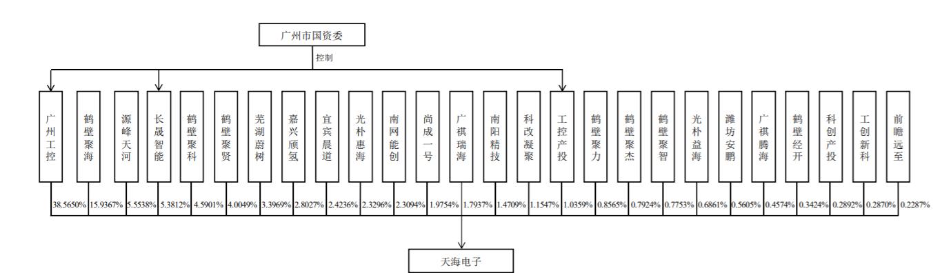 上市前,广州工控直接持有天海电子38.5650%的股份,长晟智能对天海电子的直接持股比例为5.3812%,工控产投对天海电子的直接持股比例为1.0359%,广州工控、长晟智能和工控产投为受同一控制、一致行动人关系,合计直接持股44.9821%。广州工控为天海电子的控股股东。
