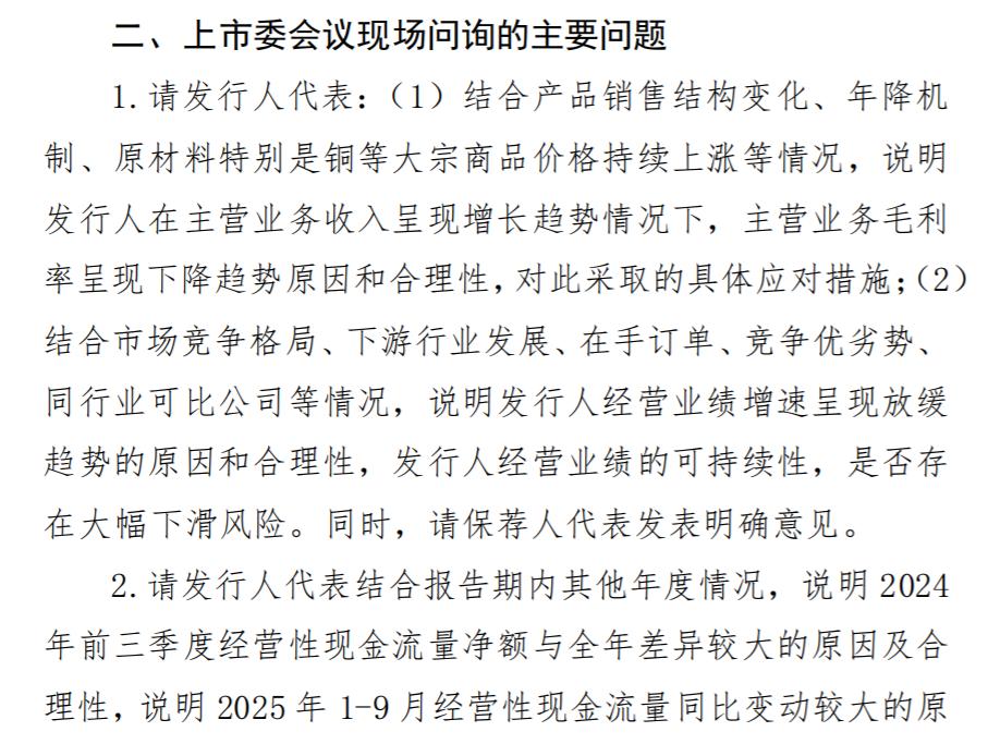 上市委会议现场,深交所要求天海电子结合产品销售结构变化、年降机制、原材料特别是铜等大宗商品价格持续上涨等情况,说明公司在主营业务收入呈现增长趋势情况下,主营业务毛利率呈现下降趋势原因和合理性,对此采取的具体应对措施;结合市场竞争格局、下游行业发展、在手订单、竞争优劣势、同行业可比公司等情况,说明公司经营业绩增速呈现放缓趋势的原因和合理性,公司经营业绩的可持续性,是否存在大幅下滑风险。