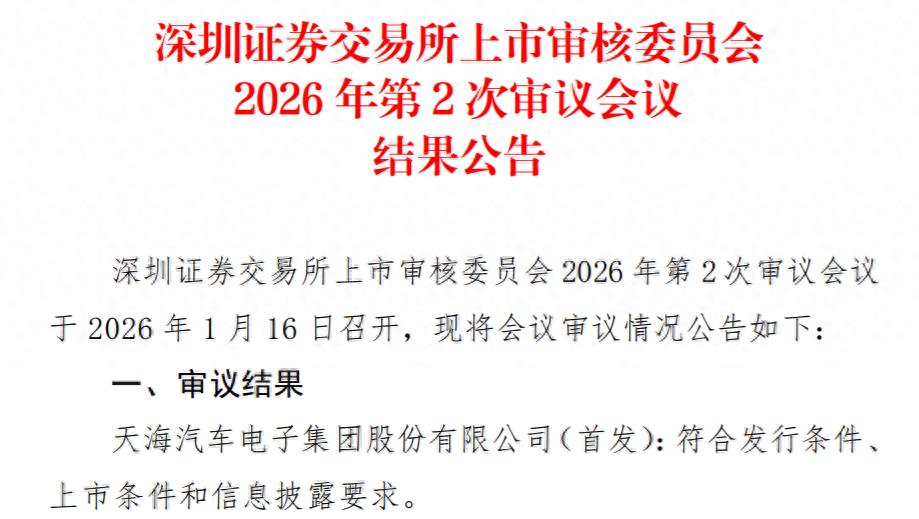 1月16日,据深交所官网,天海汽车电子集团股份有限公司(以下简称“天海电子”)(首发):符合发行条件、上市条件和信息披露要求,保荐机构为招商证券。