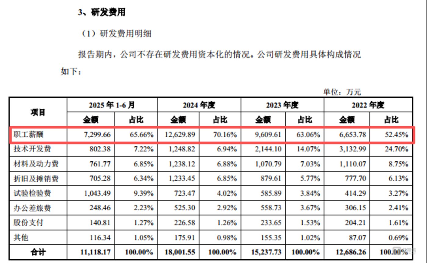 但高研发投入的背后,却浮现出研发投入质量、研发成果产出与行业水平脱节的诸多问题,与公司自述的技术创新定位似乎形成明显反差。从研发人员薪酬来看,2025年上半年公司研发费用中职工薪酬为7299.66万元,按 874名研发人员测算,其研发人员2025年年均薪酬约16.7万元。