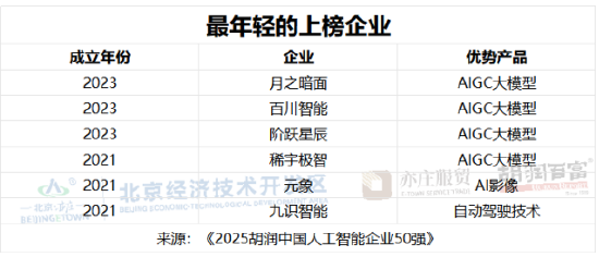 最年轻的上榜企业是月之暗面、百川智能和阶跃星辰,它们均成立于2023年,均为AIGC大模型企业
