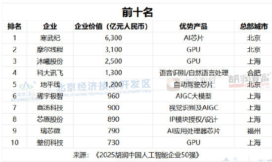2025胡润中国人工智能企业50强:寒武纪以6300亿元价值位居榜首 摩尔线程排名第二(榜单)