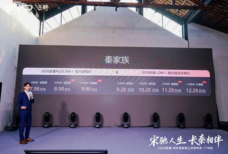近日,比亚迪王朝网推出了2026款秦PLUS DM-i、秦L DM-i及宋Pro DM-i三款长续航版本车型,售价区间分别为7.98万元-9.98万元,9.28万元-12.28万元,9.98万元-12.78万元,三款车型也正式在广州区域上市。
