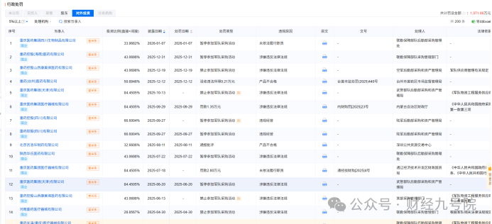 合规层面,子公司的违规行为更是触目惊心,且集中在军队采购和政府采购这一重要业务板块。2025 年以来,公司大量子公司因围标串标、未按约定履约等行为,被军队采购部门暂停或禁止参与采购活动,重庆医药集团四川生物制品有限公司、重药控股(海南)医药有限公司、重药控股山西康美徕医药有限公司等多家企业接连被通报,重庆医药集团医疗器械有限公司、河南重药医疗器械有限公司等还在地方政府采购中存在围标串标行为。