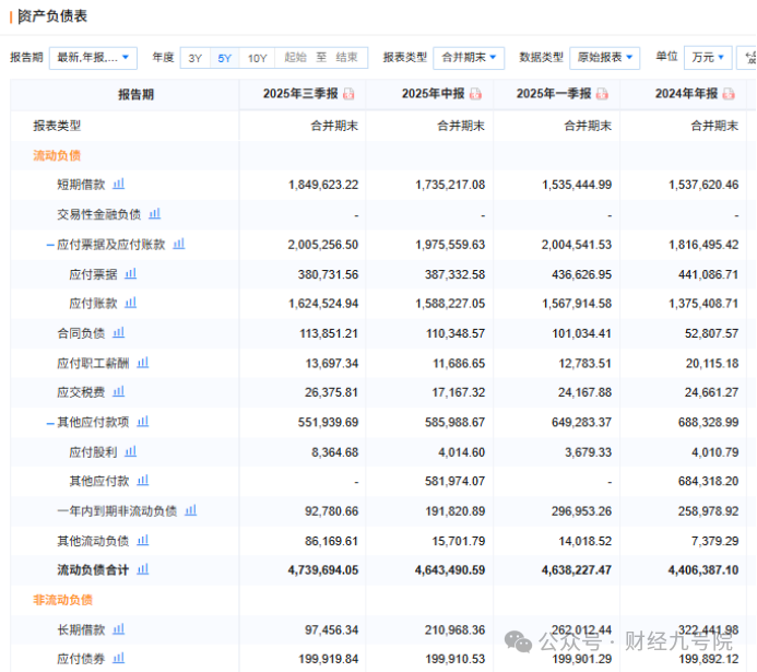 从资金储备来看,2025年公司货币资金消耗速度惊人,从年初的93.9亿元锐减至三季度末的53亿元,降幅超43%,企业可自由支配的流动资金大幅缩水。与之形成鲜明对比的是,公司债务结构向短期负债倾斜,短期负债规模从2025年初的153.76亿元猛增至三季度末的185亿元,增长超20%。还有近93亿元的一年内到期非流动负债,两项合并重药控股一年内到期的短债高达278亿元。
