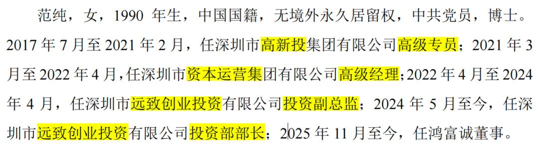 在鸿富诚披露的董事会名单中,90后女董事范纯也非常让人在意。其用了不到7年的时间从一名高级专员成为深圳市远致创业投资有限公司投资部部长。