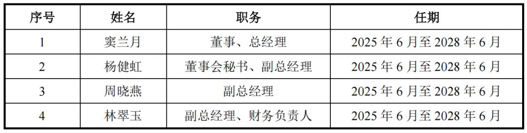 窦兰月1982年生,2004年5月加入鸿富诚,历任鸿富诚有限品管部经理、工程部经理、采购部经理、制造总监、董事、副总经理;2025年6月升任董事、总经理。窦兰月的工作侧重于产品和采购。2024年领薪127.19万元,目前间接持股0.94%。