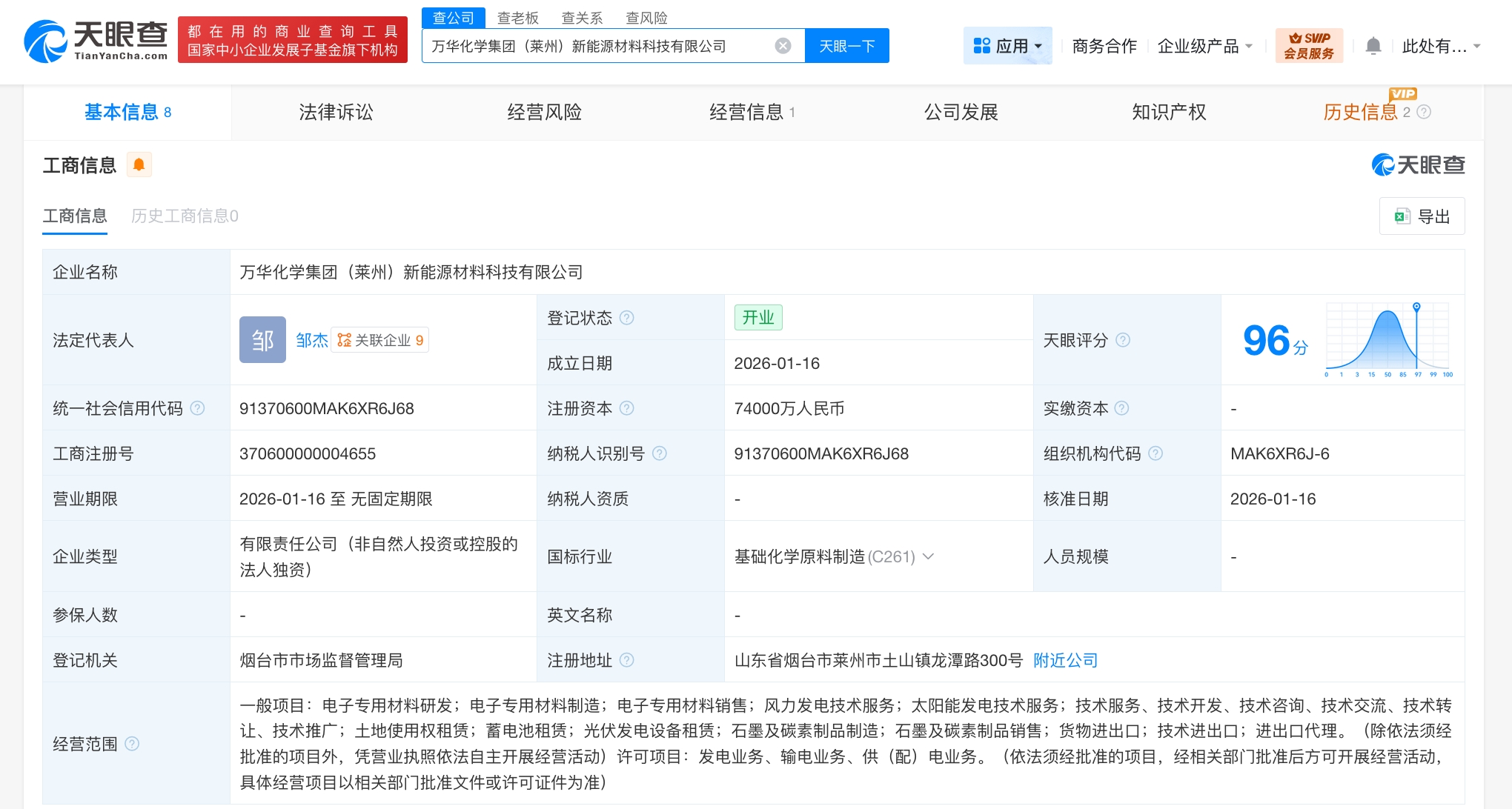 万华化学在山东成立新能源材料科技公司 注册资本7.4亿