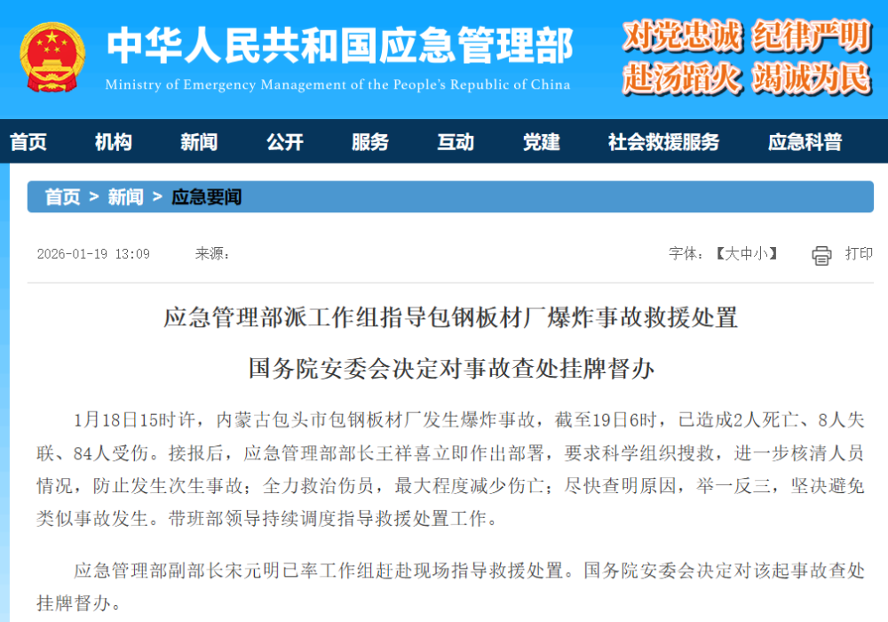 1月18日15时许,内蒙古包头市包钢板材厂发生爆炸事故,截至19日6时,已造成2人死亡、8人失联、84人受伤。接报后,应急管理部部长王祥喜立即作出部署,要求科学组织搜救,进一步核清人员情况,防止发生次生事故;全力救治伤员,最大程度减少伤亡;尽快查明原因,举一反三,坚决避免类似事故发生。带班部领导持续调度指导救援处置工作。
