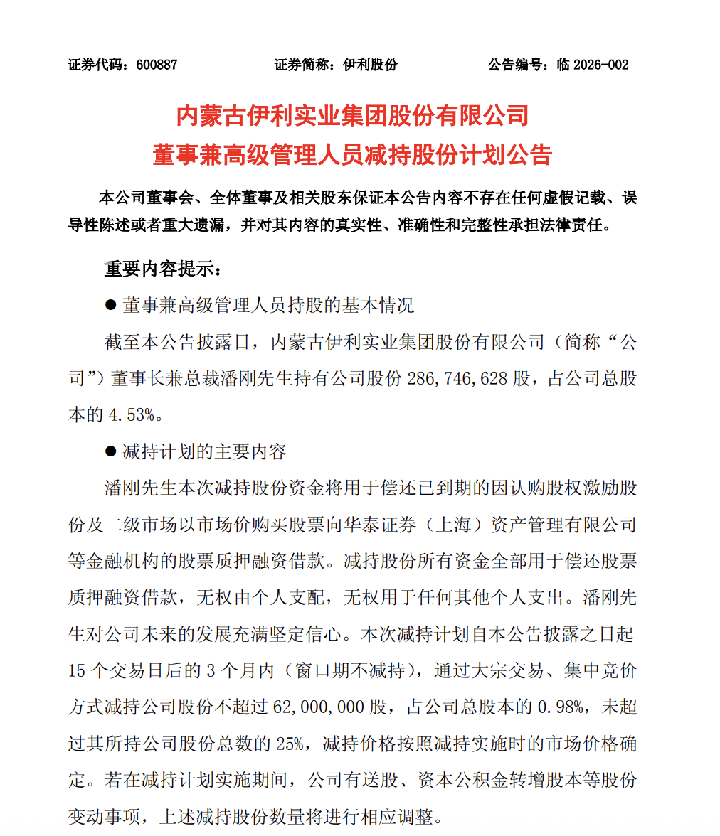 1月7日,伊利股份公告称,公司董事长兼总裁潘刚计划在通过大宗交易、集中竞价方式减持不超过6200万股,占公司总股本的0.98%,减持股份来源于股权激励及集中竞价取得。本次减持计划为自公告披露之日起15个交易日后的3个月内,即2026年1月29日到2026年4月14日期间。