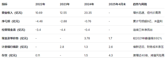 更致命的危机在于现金流。数据显示,公司的现金及现金等价物已从2021年末22亿元的峰值,断崖式下跌至2025年4月末的1.7亿元,消耗幅度超过92%。与此同时,公司经营活动产生的现金流量净额连续三年为负(2022-2024年分别为-3.4亿元、-4.4亿元和-0.4亿元),意味着其主业长期处于“失血”状态。