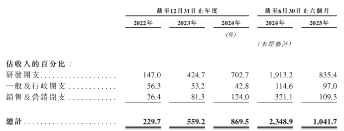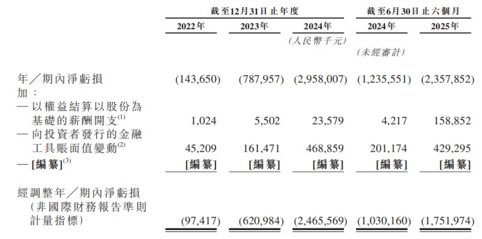 更关键的是,智谱的研发投入极高且亏损持续扩大。招股书显示,2022年至2025年上半年,公司研发支出分别为0.84、5.29、21.95和15.95亿元,占收入的比例分别为147%、425%、703%和835%。而与此同时,2022年至2025年上半年,公司的净亏损达到了1.44亿元、7.88亿元、29.58亿元和23.58亿元,亏损严重。