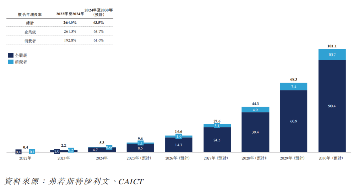 弗若斯特沙利文数据显示,2024年中国大语言模型市场规模已达到53亿元,其中B端市场规模约47亿元,C端市场规模约6亿元。随著大语言模型技术的进步与市场需求的扩张,预计2030年市场规模将增至1011亿元,复合年增长率为63.5%。