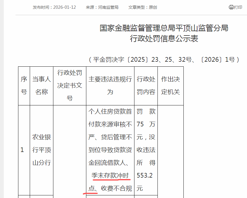 国家金融监管总局平顶山监管分局处罚信息公示表显示,某大行平顶山分行因为季末存款冲时点等5项内容被重罚75万元。