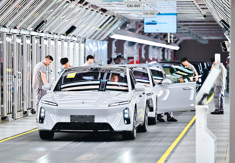 受访者认为,低空经济发展火热并非偶然。这背后离不开基础设施网、空中航路网、通信导航网、空域管理网、低空服务网等支撑低空经济发展的智慧低空新基建不断完善。据中国AOPA通用机场研究中心统计,截至2024年12月31日,全国在册通用机场已达475个;全国注册无人机126.7万架;全国5G基站总数达350.9万个。这些智慧低空新基建成为低空经济发展的重要引擎。位于安徽省合肥市新桥智能电动汽车产业园蔚来第二工厂的新能源汽车生产线(2025 年 7 月 1 日摄)周牧摄/本刊