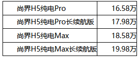 尚界H5纯电版是一款定位20万级的新能源SUV,售价区间为16.58-19.98万元,含纯电 Pro、Pro 长续航版、Max、Max 长续航版四款型号。该车秉承华为设计美学,提供六款车色与四款内饰色系,搭配10.25英寸仪表与15.6英寸中控屏,呈现简约科技感。