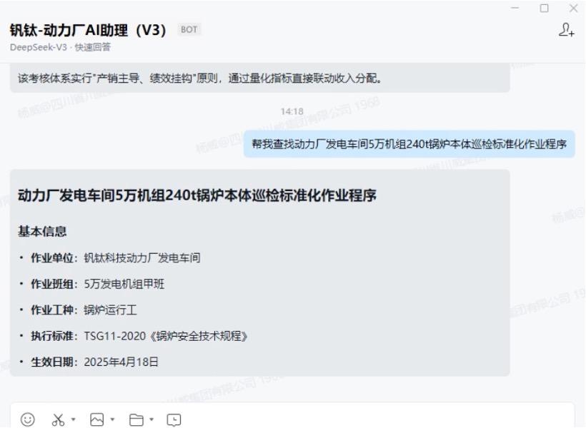 钒钛科技板材厂的科长邹俊和员工姚洋都是AI助手的深度用户。“厂里的体系文件、制度、生产标准、设备参数,文档多得看不过来。”邹俊介绍,他们将所有文件“喂”给自建的AI助手,如今查询任何制度或参数,只需像聊天一样提问,助手便能快速定位、精准回答。更关键的是,当需要组织培训考试时,邹俊只需指令助手“根据某管理办法出10道选择题、5道填空题”,一份初步试题很快就能生成,极大提升了行政效率。