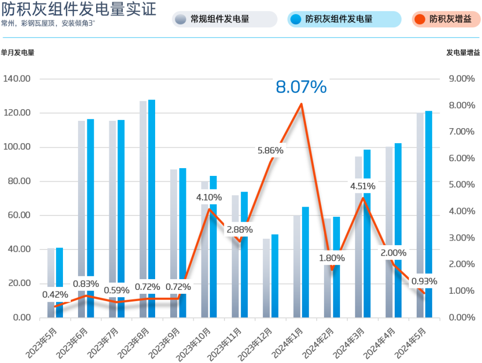 · 发电效率提升:采用210R-66版型设计,减少因积灰造成发电量损失20%-30%。户外实证显示,防积灰组件全年发电量增益2.22%,最高单月增益超过8%。积灰越严重,发电增益越明显。