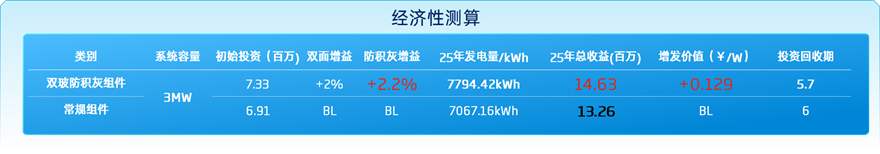 · 综合度电成本更低:以3MW浙江工商业彩钢瓦项目为例,经测算,防积灰组件较常规组件,其双面+防积灰属性带来的增发价值0.129¥/W,投资回收期降低0.3年。